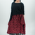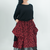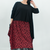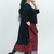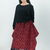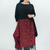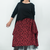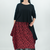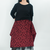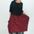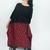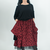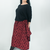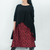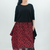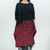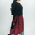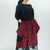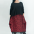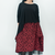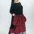 Der Rock ist aus festlichem Taftstoff mit einem schwarz-roten Karomuster und einem Blumenflockdruck. Er hat einen hohen Taillenbund aus Baumwoll-Bündchen Stoff. Seitlich ist der Rock drapiert und hat in der Drapierung die Taschen eingenäht.